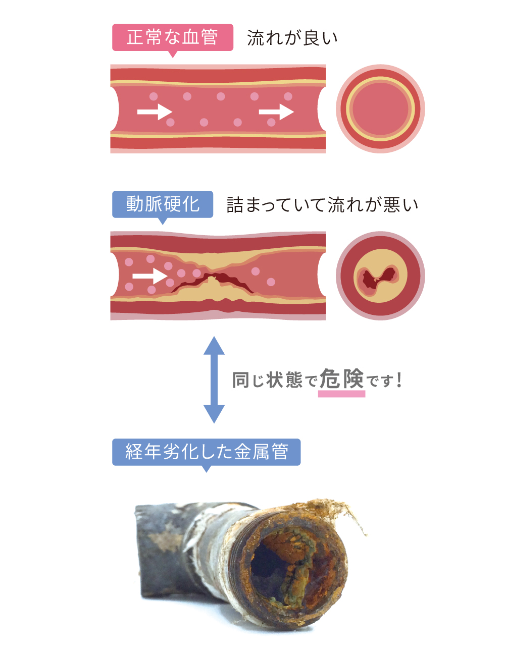血管の中でコレステロールが固まり動脈硬化を起こしている状態と同じです。